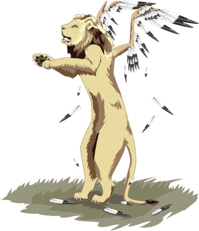 4 The first was like a lion, and had eagle’s wings. I watched till its wings were plucked off; and it was lifted up from the earth and made to stand on two feet like a man, and a man’s heart was given to it.